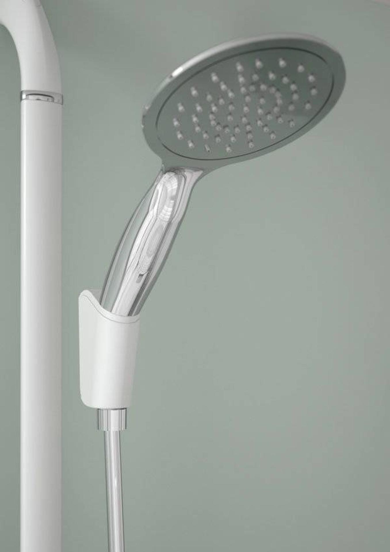 L'espace de douche est composé d'un pare bain en verre de 6mm d'épaisseur transparent avec volet pivotant à 180° qui limite les éclaboussures. Un siège blanc relevable avec une large assise ainsi qu'une ou plusieurs barres de maintien vous procure un espace sécurisé. Pour compléter cette sécurisation de l'espace, la barre de douche en T peut aussi servir de barre de maintien tandis que la douchette à main aimantée est équipée d'un flexible anti-torsion.