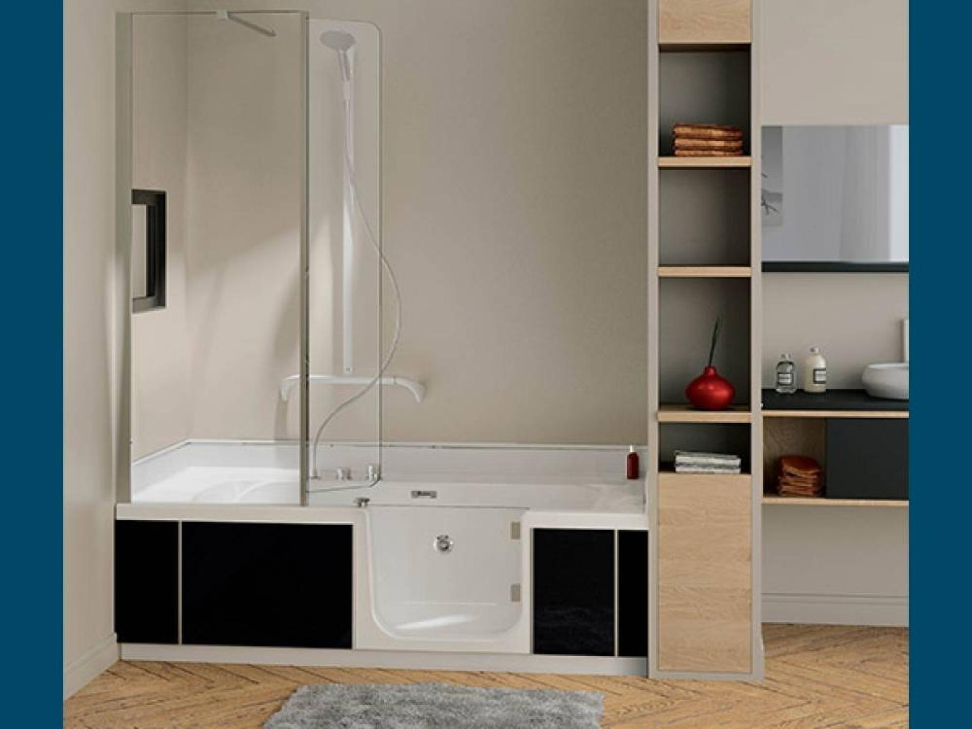 La baignoire à porte KINEDUO est composée d'un habillage en verre, blanc ou noir, ainsi d'une crédence qui apporte un design moderne et raffiné.