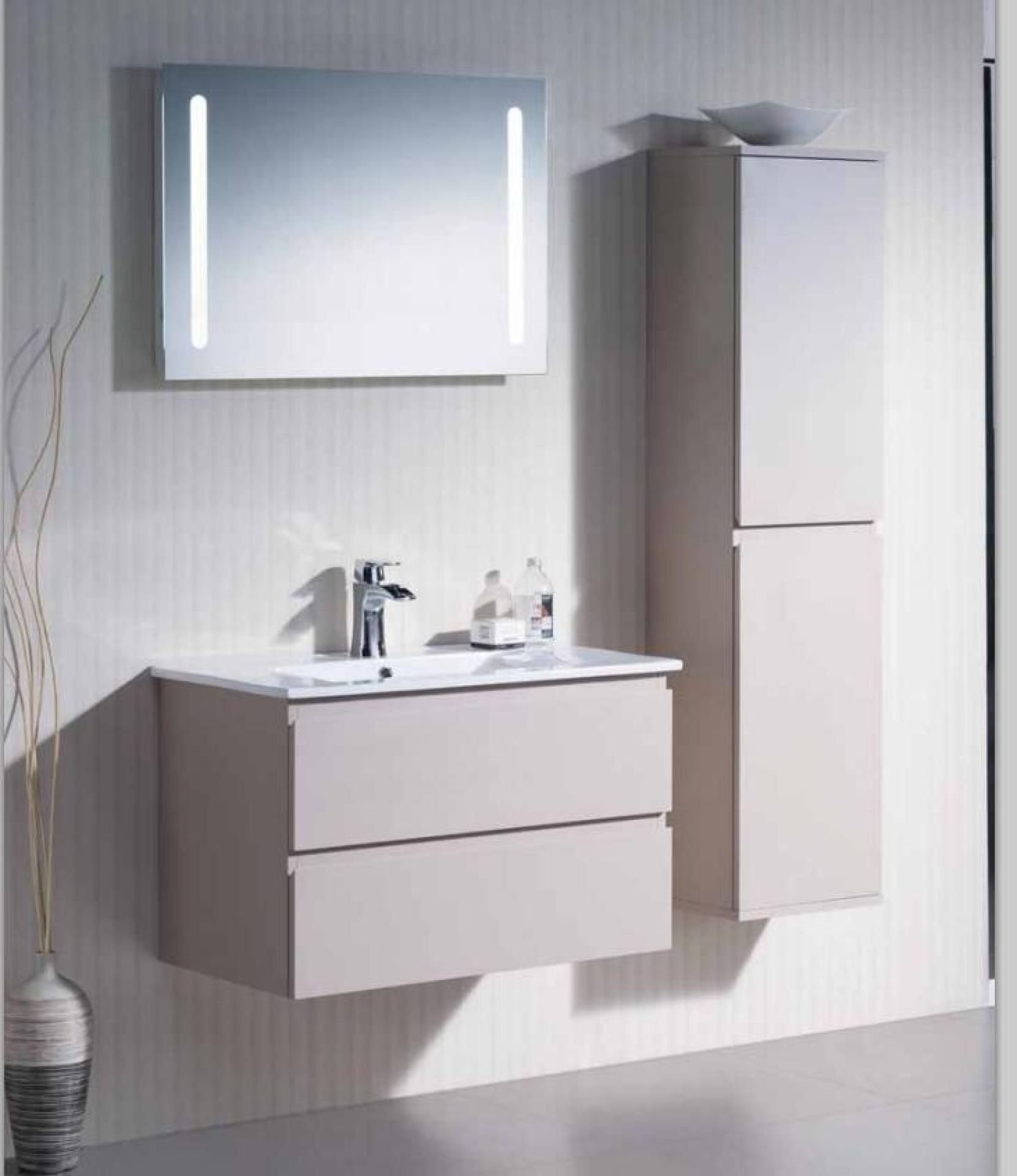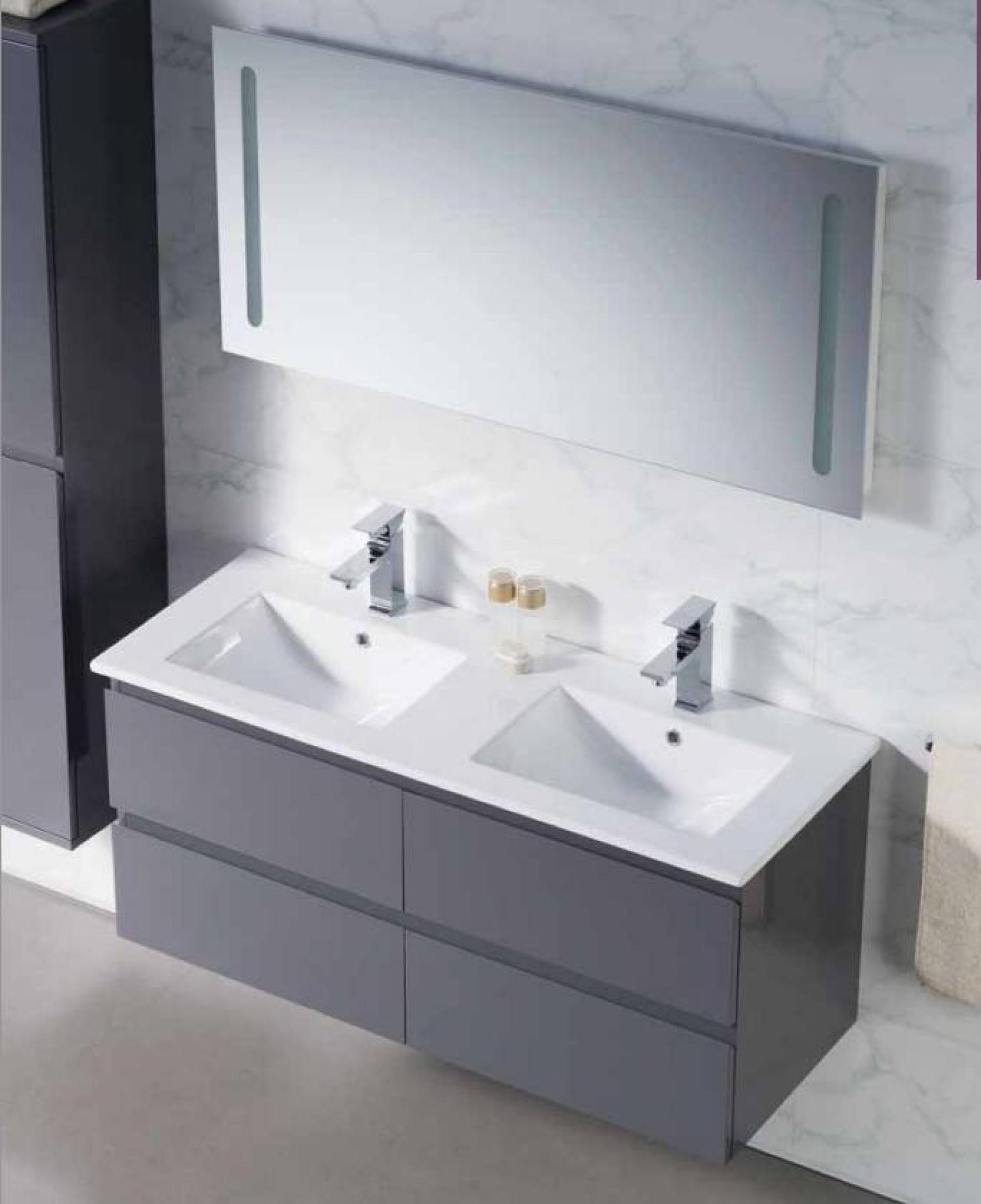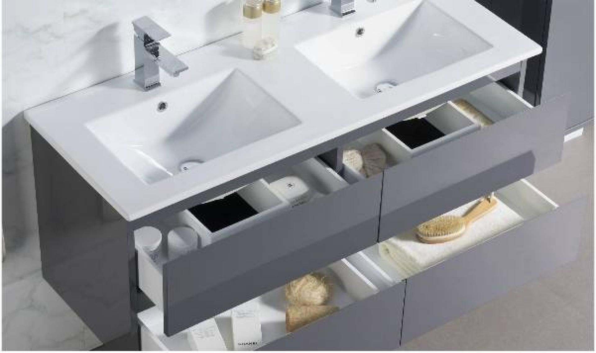 Il est constitué de panneaux et caisson en MDF certifiés PEFC, les tiroirs sont équipés de glissières métalliques avec le système PUSH pour l'ouverture ainsi que le système SOFT CLOSE pour la fermeture progressive et silencieuse, une vasque simple ou double en céramique blanc avec trop-plein, un mitigeur HANSGROHE et son miroir.